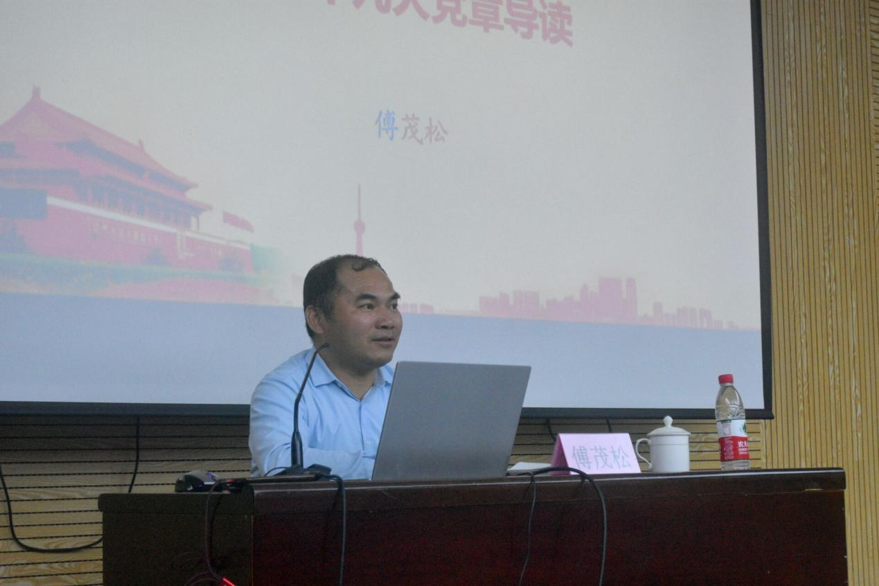 就“党章含义”,傅老师强调党章是最高党法、根本大法,介绍了党章的基本内容,并具体说明了党章对于党的四个“根本”地位和党章所具有的三个属性,从而得出结论——我们要原原本本地学好新党章。