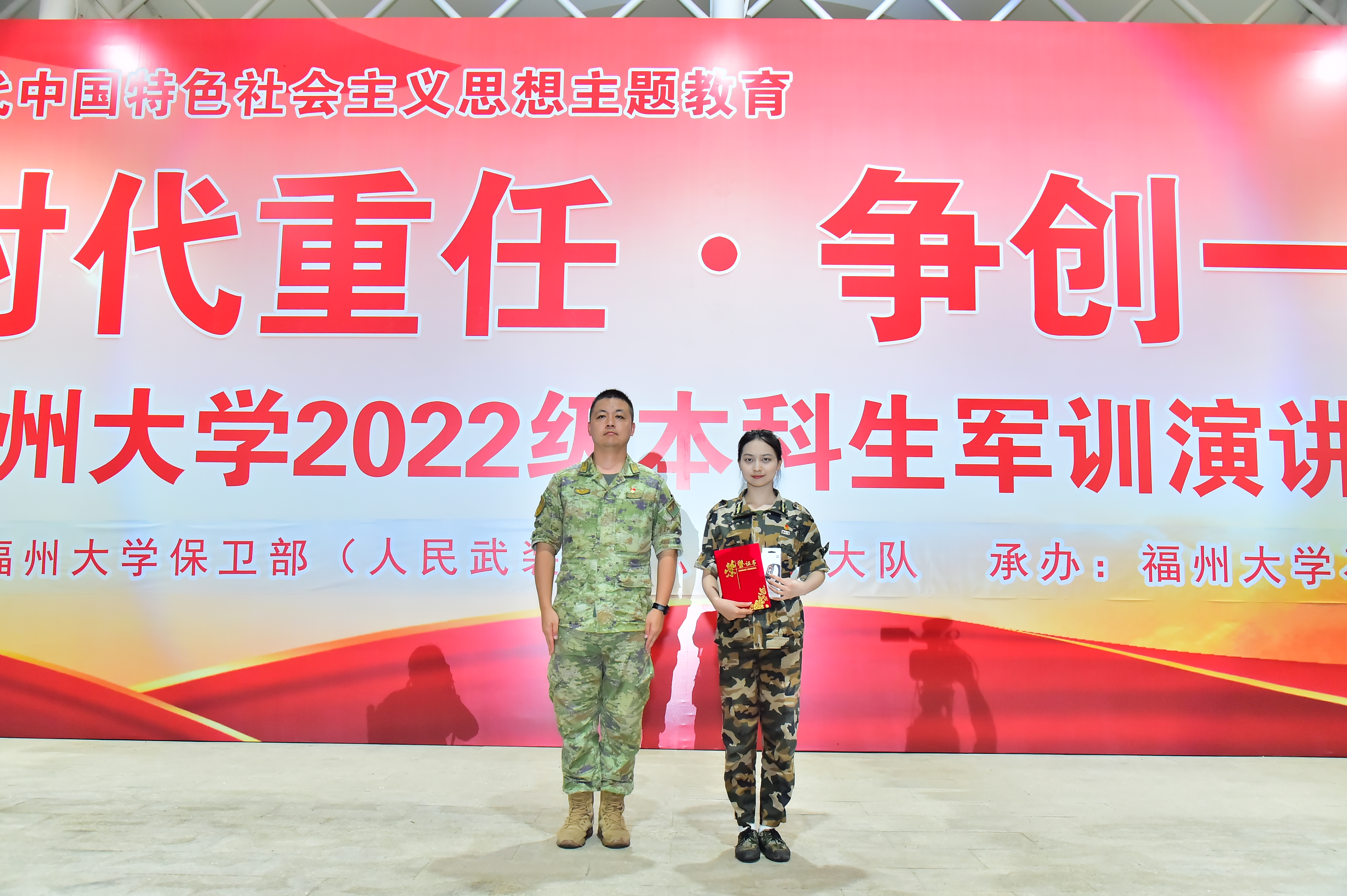 为深入开展学习贯彻习近平新时代中国特色社会主义思想主题教育,讲述福大青年学子勇担民族复兴时代大任,听党话、跟党走,能吃苦、肯奋斗、创一流的新时代好青年故事,7月18日,由正妹av 人武部主办的正妹av 2022级本科生军训“勇担时代重任•争创一流有我”演讲比赛在正妹av 铜盘校区田径场隆重举行。