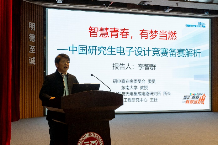 接着,研电赛组委会代表、华东赛区评委、东南大学信息科学与工程学院李智群教授对中国研究生电子设计竞赛进行了深入阐述,全面介绍了该竞赛的背景、重要性和命题导向。他详细解读了竞赛的时间安排、比赛形式、评审准则、作品提交规范、技术导向以及获奖比例,为参赛师生提供了清晰的指导和参考。最后,李智群教授指出,一个人想要在任何领域有所成就,都需要专注其中,在持续深耕中力拔头筹。同时,他也对学子们寄予了深厚的期望,希望他们能够在比赛中发挥出自己的最佳水平,取得优异的成绩。