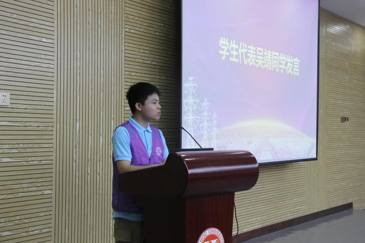 吴靖同学是学院“强化共同体意识,共筑民族复兴梦”院级重点实践队的队长。他认为,暑期“三下乡”社会实践是青年学生了解国情、社情、民情的重要载体,是青年学生受教育、学知识、做贡献的主要渠道。同时,他提出了三点感受与大家共勉:一是要自信自强,坚定不移跟党走好中国道路;二是要担当奋斗,以实际行动传承弘扬电气精神;三是要团结一心,同当地群众一道凝聚起强大社会力量。最后,他预祝每位同学都能在接下来的实践中有所收获;在这堂与现实相结合的“大思政课”中“受教育、长才干、做贡献”,奋力书写为中国式现代化挺膺担当的青春篇章。