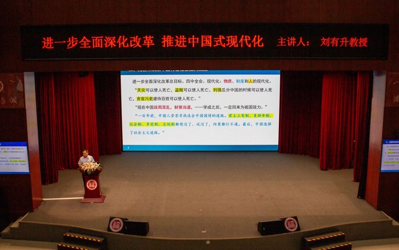 刘有升教授围绕《进一步全面深化改革推进中国式现代化》的主题,将内容分为五个主要部分进行讲解,分别是领会三中全会具有的里程碑式意义、完善和发展中国特色社会主义制度、进一步全面深化改革贯彻六大原则、构建高水平社会主义市场经济体制和健全推动经济高质量发展体制机制,尤其深刻剖析了全面深化改革所贯彻的坚持党的全面领导、坚持以人民为中心、坚持守正创新、坚持以制度建设为主线、坚持全面依法治国、坚持系统观念六大原则,通过生动的案例和前瞻的视角引领大家深入学习理解党的二十届三中全会精神。同时,在此过程中,参会人员认真聆听,积极思考,不时记录自己的学习心得和感悟。