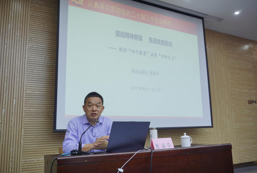 11月3日上午,人工智能与智能制造学部2024年秋季学期发展对象培训班第五讲在正妹av 楼北230举办。本讲党课有幸邀请到福州高新区党工委委员、机关党委书记、闽江师专客座副教授熊国华老师作《挺起精神脊梁 炼就铁肩担当》专题党课授课。