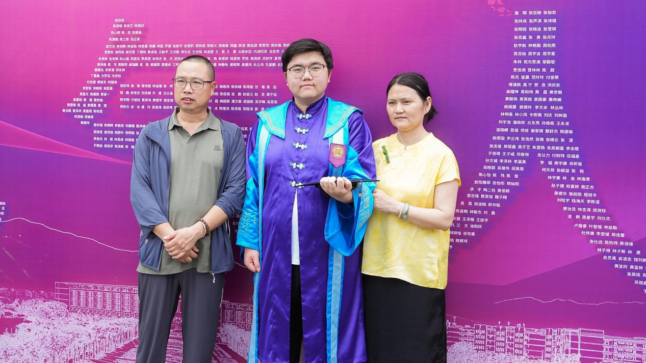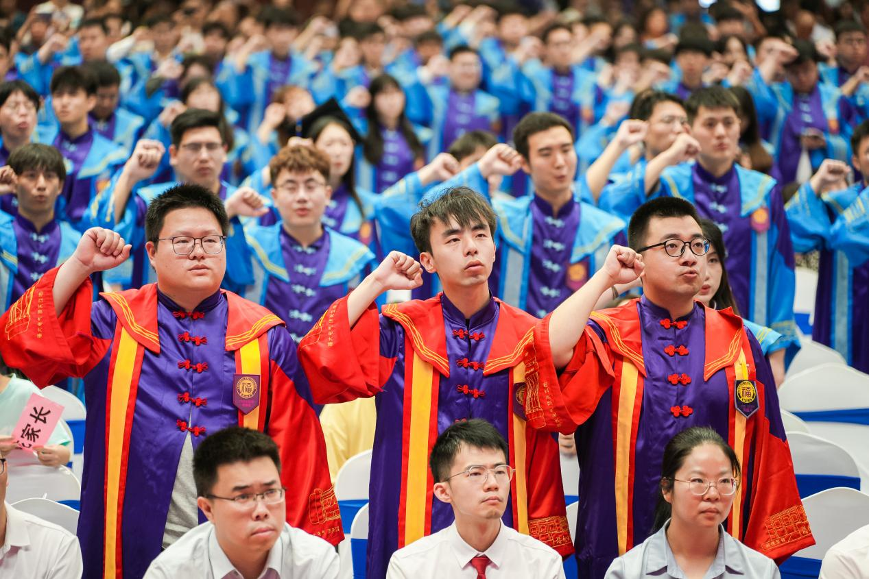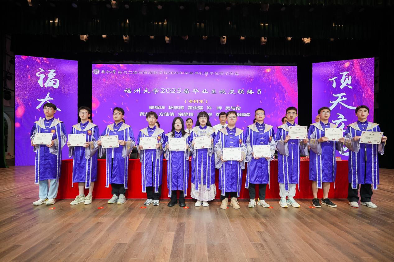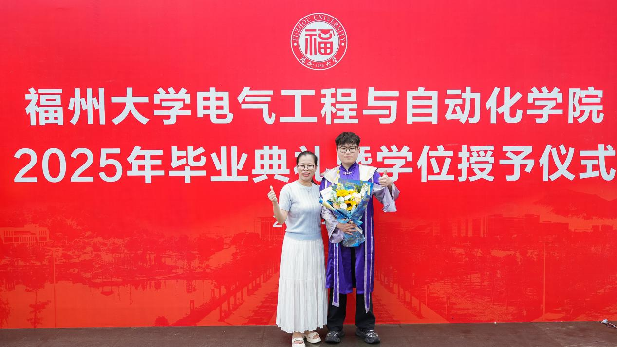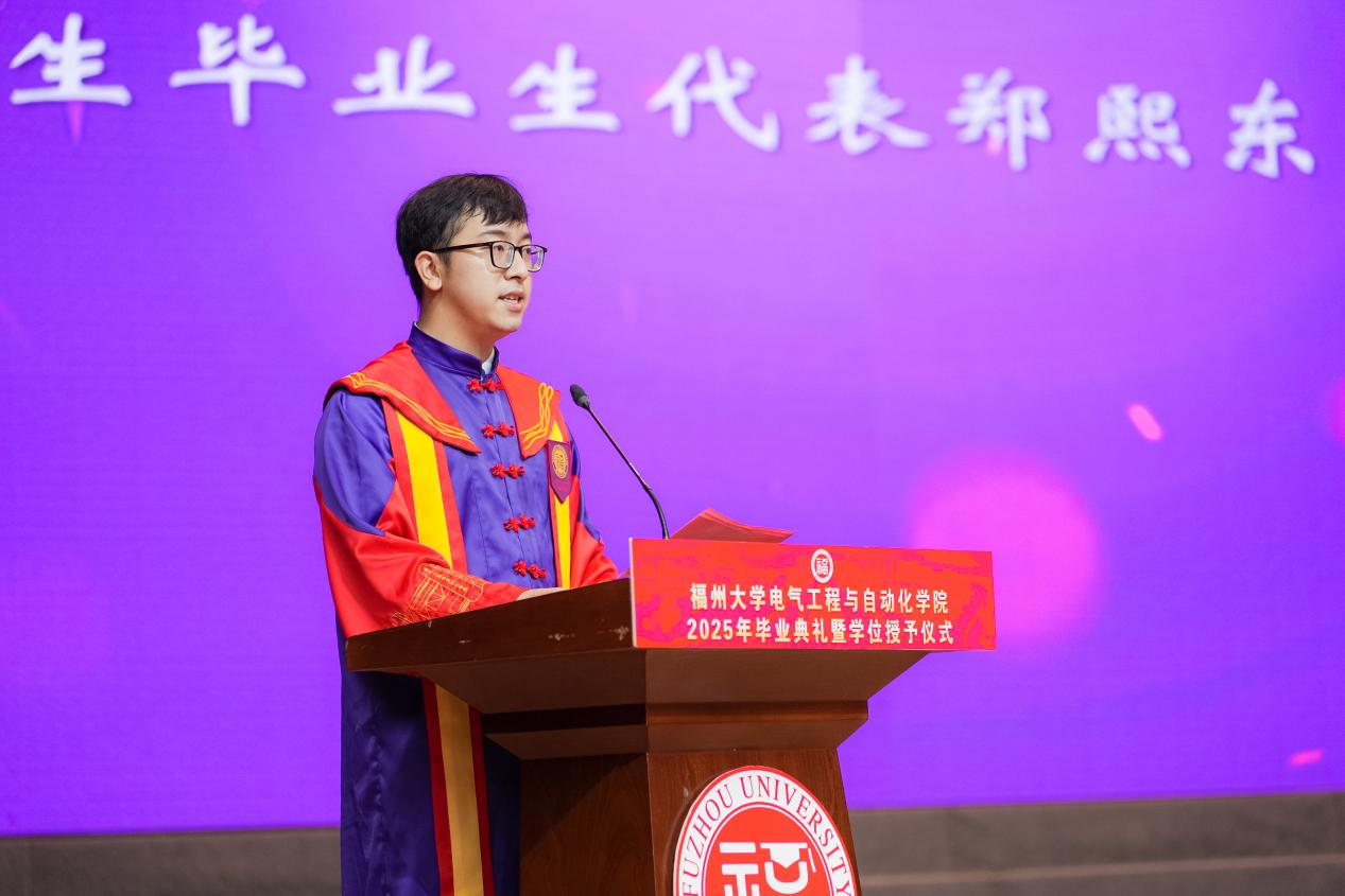 “指尖轻抚学位服上的院徽,仿佛与福大电气人的精神血脉产生了共鸣。这袭学位服,不仅象征着电气人的专属荣光,更是责任与希望的传承信物,凝聚着代代校友薪火相传的电气精神。临别之际,愿我们永葆福大人“榕树般”的韧劲,在风浪中扎深创新之根;铭记“明德至诚,博学远志”的校训,在科技强国的赛道上跑出福大人的加速度。此去星辰大海,愿我们乘风破浪,不负韶华,不负母校厚望!”