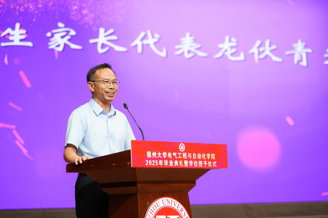 “最后,我想用诗人纪伯伦的话作结:‘你们的孩子,其实不是你们的孩子,他们是生命对自身的渴望。’今天,我们终于可以骄傲地说:你们已长成了自己的模样!去吧,带着感恩与勇敢,带着福大之福,带着福大电气之底气,去融入去主宰浩瀚的星辰大海!去创造属于你们的大美大福!”