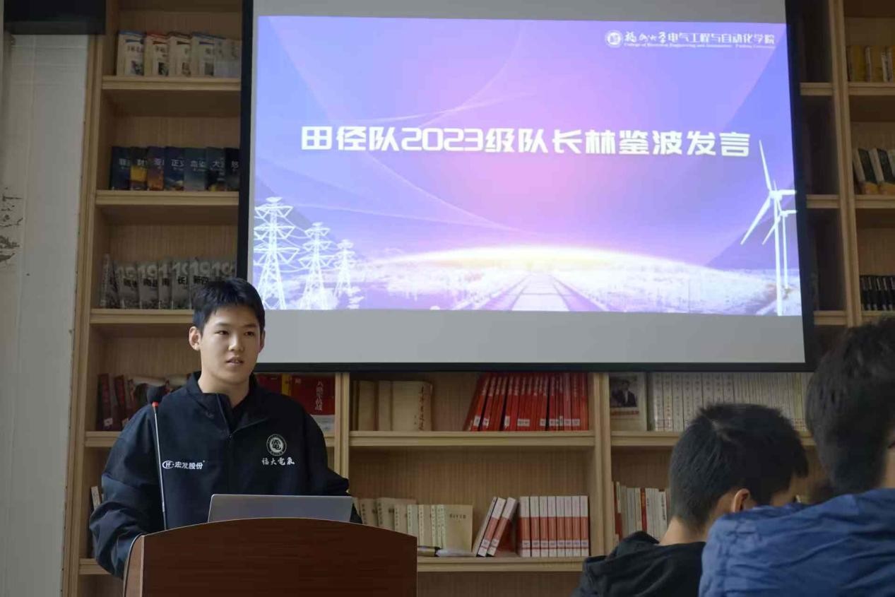田径队2023级队长林鉴波首先表达了对共同带队的学长学姐的指引、全体队员在运动会备战和比赛期间的互相帮助和共同承担的感谢。他针对宣传、人员分配、活动组织等方面对此次运动会的困难与应对进行了分析,表示学院上下共同努力才能优势互补。接着,他对运动会的备战过程提出了建议,积极发展体育部及体育中心、研会有工作能力的人,提前了解田径队事务做好分工;最后,他鼓励同学们积极反映实际困难和需求,以便于学院给予恰当的支持,以协同合作推动队伍发展。他表示,队长经历让自己不断成长,并且感谢大家对田径队的支持。
