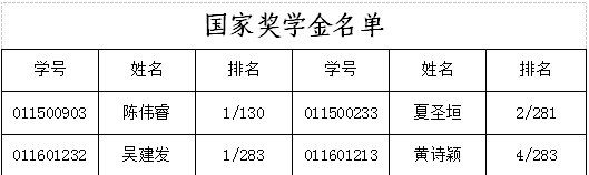关于做好2017-2018学年本科生国家励志奖学金评审工作的通知》文件精神,经本人申请,年级推荐,学院领导研究决定:陈伟睿等4位同学获国家奖学金,陈锦鹏等56位同学获国家励志奖学金,具体名单如下: