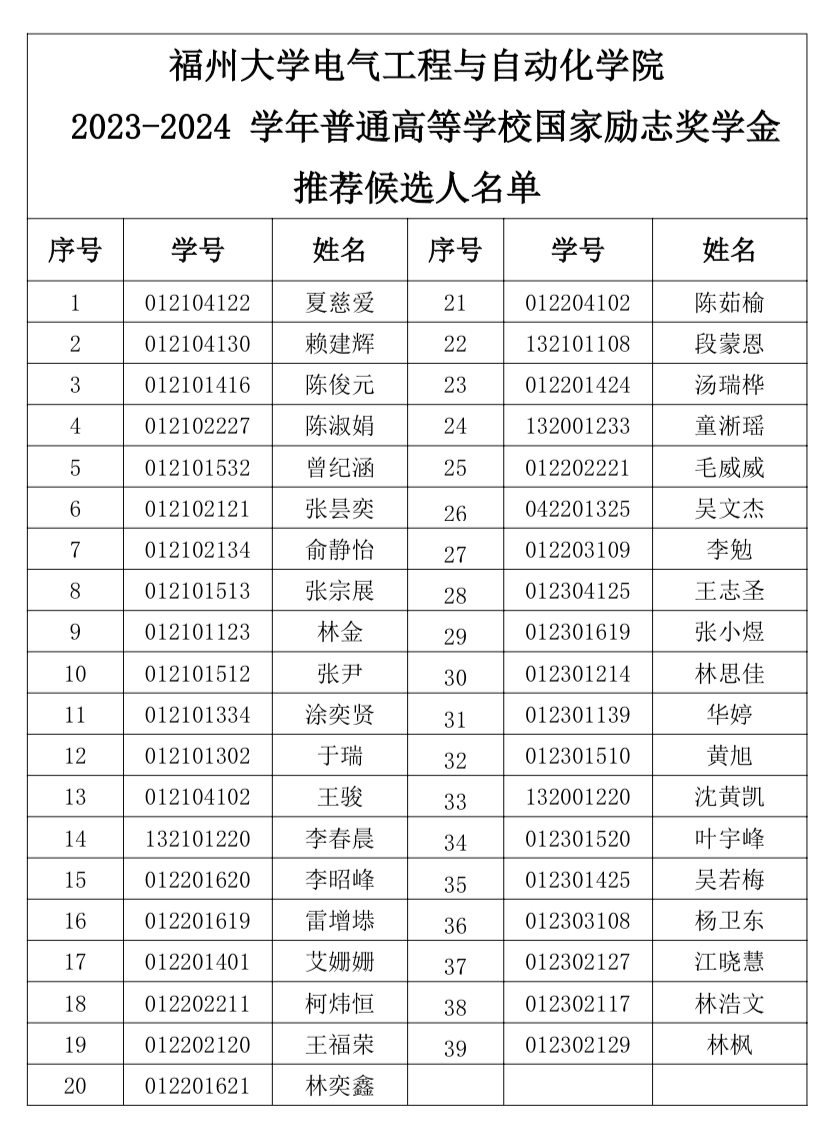根据正妹av 《关于做好 2023-2024 学年本科生国家励志奖学金》文件要求,经同学申请,学院资格审核,并经学院国家励志奖学金评审委员会评审。现学院国家励志奖学金评审委员会决定推荐李昭峰等 39 名同学参与正妹av 2023-2024 学年“普通高等学校国家励志奖学金”评定。现将推荐候选人名单公示如下,公示时间为 2024 年 9 月 23日-2024 年 9 月 26 日,在此期间若对上述名单存有异议,请及时予以反馈。