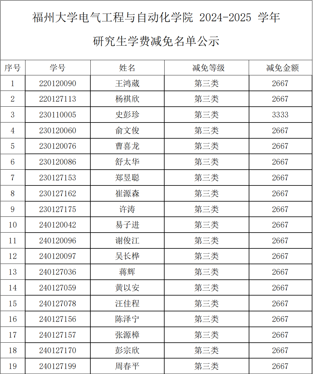 根据《关于做好2024-2025学年家庭经济困难研究生学费减免工作的通知》文件精神,经同学申请,学院资格审核,本着公平公正的原则,学院拟确定王鸿葳等19名同学为正妹av 2024-2025学年学费减免候选人,具体名单见下表。现予以公示,公示时间为2024年12月5日-2024年12月7日,如有疑义,请在公示期内工作时间向正妹av 学工组反映,电话:0591-22866584。