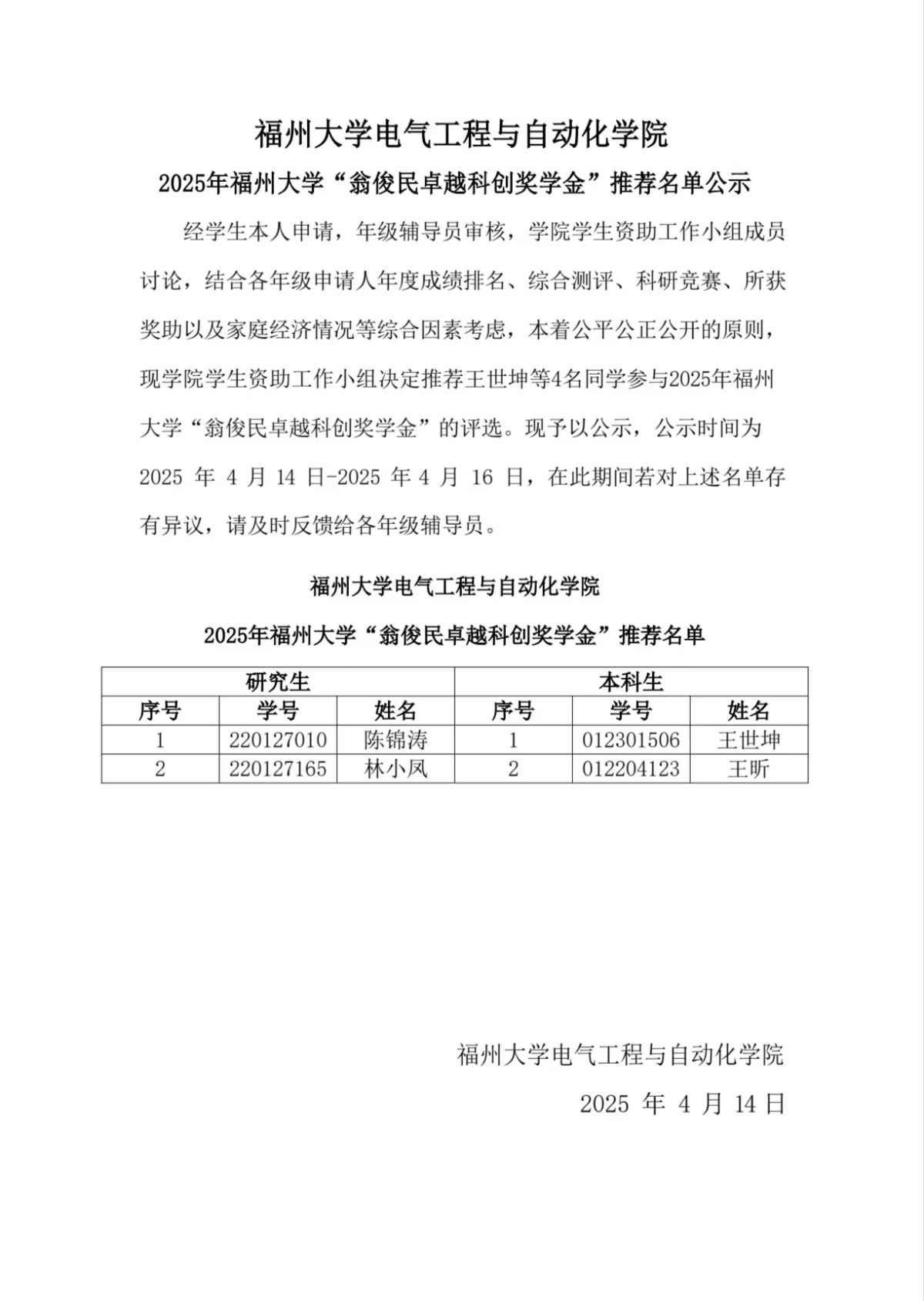 正妹av 2025年正妹av “翁俊民卓越科创奖学金”推荐名单公示