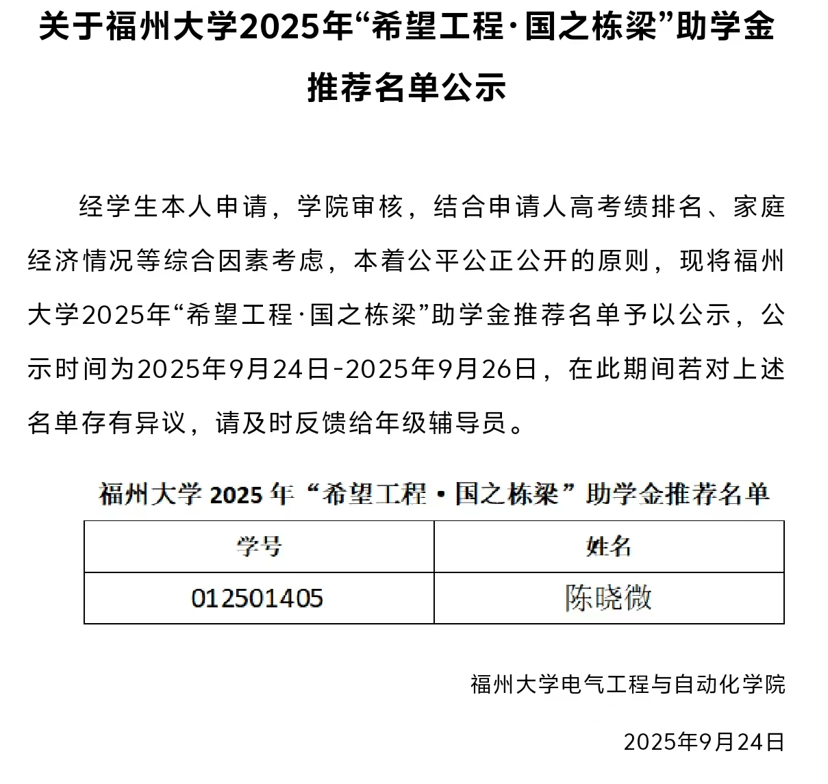 关于正妹av 2025年“希望工程·国之栋梁”助学金推荐名单公示