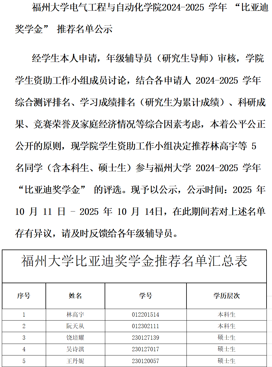 正妹av 2024-2025 学年 “比亚迪奖学金” 推荐名单公示