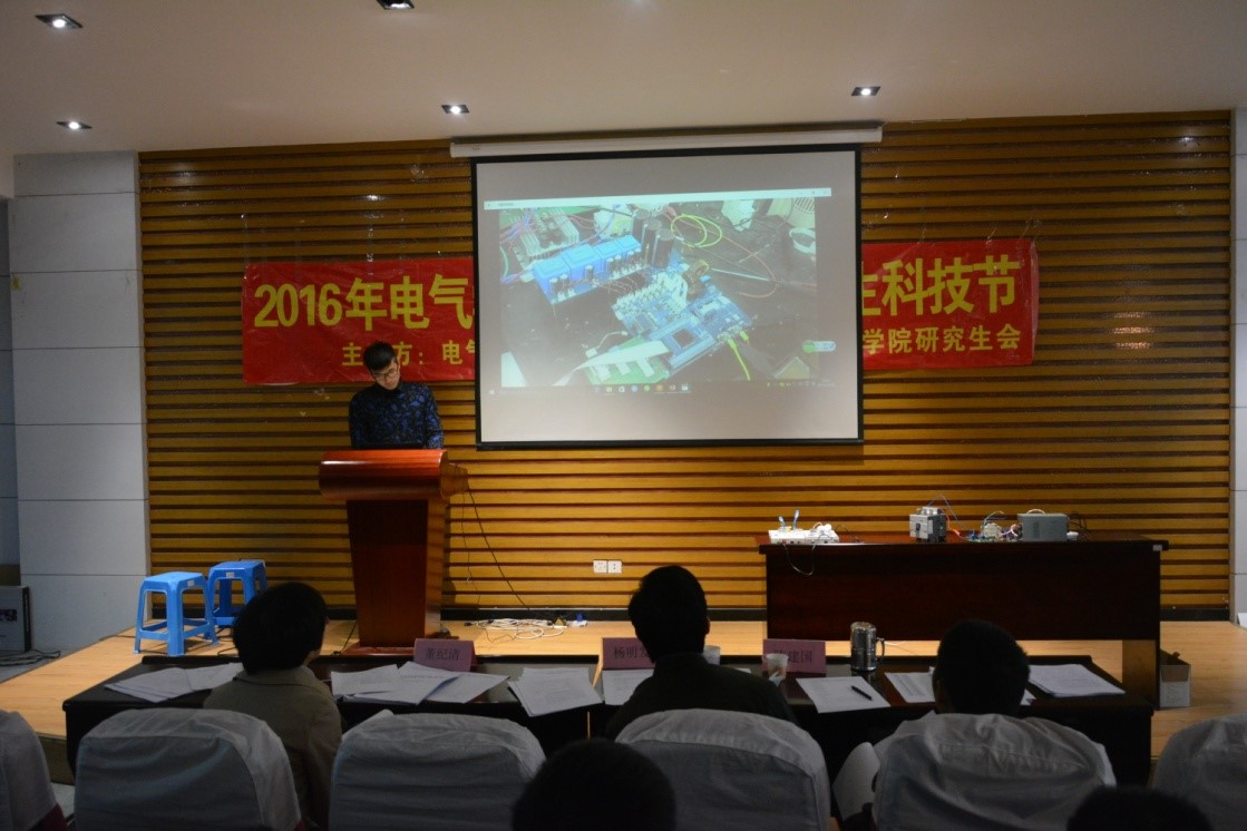 比赛开始前主持人黄晶晶与大家进行了一场国学知识小问答的小游戏,不仅活跃了场上的气氛,还缓解了参赛选手们紧张的情绪。小游戏过后比赛正式开始。首先向我们展示的是林弘毅队伍,该队伍由三位本科同学组成,其主题是基于stm32的智能分拣搬运机器人,他从现状,意义以及实现手段等方面来向我们阐明其研究;接下来是刘伟明队伍,基于LDC电感金属传感器的智能小车,该小组的智能车,机动灵活,适应能力强;第三只为何立松团队带来的是一种单位功率因数的单级降压LED驱动电路及其非线性控制;第四组郑端端等同学展示了多负载无线充电平台,该组带来的作品非常新颖,博人眼球;中途短暂休息后,我们迎来了第五队—王阳团队,他们的作品为单极智能接触器控制模块与通信模块的设计;第六队为陈韬珉团队,他们队伍带来的是C28x+CLA高频数字化逆变器仿真研究,通过PPT讲解和实物的视频演示充分展现了该作品对于实现高频数字化的特点;最后两组张长坤和郭跃森团队分别对基于电流闭环的交流接触器智能控制模块与高效高功率密度DC/DC电源设计做了非常详细的解答。八只参赛队伍的作品在实用性,创新性上都具有非常大的突破,三位教授也给予了非常大的肯定。