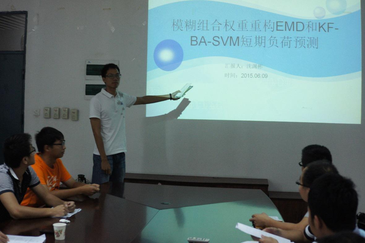 首先上场的是沈渊彬同学,他报告的题目是《模糊组合权重重构EMD和KF-BA-SVM短期负荷预测》,重点阐述了利用主成分分析方法(PCA)确定输入量,从而得到待预测日的负荷值。接着是钟齐美同学的《配电网多级分布式单相接地故障选线系统》,他介绍了三种中性点非直接接地方式以及馈线终端、母线集中器、选线主机的设计。紧接着,陈东鹏同学的《电力变压器油纸绝缘系统气隙特征分析》报告在理解介质响应理论基础上,建立模拟试验模型,研究了不同充电时间下绝缘系统中气隙含量的变化对回复电压特征参数的影响规律,表明回复电压特征参数可以有效衡量绝缘系统的气隙情况的结论。其次是翁桂萍同学的《计及峰谷电价和改进运行策略的风光储联合发电系统容量优化》,其在建立系统的优化配置模型的基础上,提出改进的运行策略,并以华东沿海某小区为例,验证所提方法的合理性和优越性。再者是吴小雁同学的《超高压交流输电线路电磁场计算分析》,在建立输电线物理模型的基础上,对其进行优化使得输电线下方的电磁场值更接近实际值。最后是鲍智恩同学的《低压配电网在线监测系统设计》,通过对现有在线监测系统比较和分析,综合考虑系统信息传递的高效性,信息的安全性,低压配电网管理的便捷性,采用C/S和B/S混合式结构的低压配电网在线监测系统设计方案。