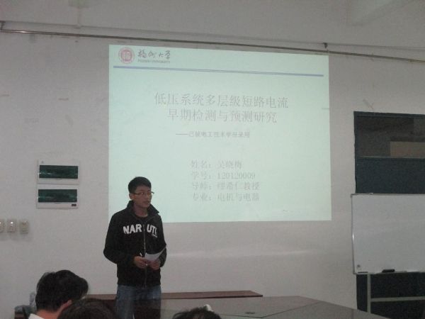 在主持人的简单开场之后,比赛正式开始。首先进行陈述的是吴晓梅同学的《低压系统多层级短路电流早期检测与预测研究》,吴晓梅同学首先对现有低压系统短路电流峰值的检测进行了比较,然后对短路电流的波形进行了分析,最后提出了自己全新的多层级短路电流早期检测与预测方法,该方法的仿真结果比传统方法反应时间更短,而且动作更加精确,评委老师也对吴晓梅同学的论文细节进行了详细的询问与探讨。接下来何晓燕同学就《交流接触器虚拟样机设计技术》进行了展示,通过各种基础学科的知识串联,同时结合实际的产品,何晓燕同学建立了一个3D交流接触器虚拟样机,并进行了仿真。紧接着许晔同学对《采用仿射不变矩阵的谐振接地系统故障选线方法研究》进行阐述,在阐释结束后刘庆珍老师对该论文的实用性问题与许晔同学进行深入的交流探讨并发表了自己的看法。之后李安娜同学展示了《油纸绝缘系统混联等效电路及参数辨识的研究》,由于该篇论文提出的混联等效电路是一种新的尝试,目前还没有任何相关的研究,因此李同学这篇高质量的论文目前已被EI收录。在四位同学的陈述之后,紧张的比赛暂时告一段落,主持在大家休息的期间进行了抽奖环节,不少同学都拿到了奖品。在短暂的休息之后,比赛继续,李彪同学作为最后一个研究生代表,对《短路早期检测的中压故障电流快速限制技术》进行了陈述,但李彪同学由于有事无法现场参与活动,于是他请同学王田代他进行陈述。该论文探讨的问题与之前吴晓梅同学的论文相类似,但是是不同电压等级下的短路问题。接下来就轮到了最精彩的博士论文陈述部分了,首先登场的李超博士陈述了《采用晶体劈和成像检测模式的新型OCS设计》,李超博士思路清晰的从OCS的发展历史开始介绍,逐步深入讲解传统OCS由于靠检测光强来检测的电流,受到环境限制十分严格而且检测不准的问题,提出了自己全新的不依赖于检测光强的新方法,而且进行的实物验证,效果十分理想,评委老师也对李超博士的论文部分进行了讨教。接下来上场的黄晓生博士展示了《线圈高频损耗解析算法改进及在无线电能传输磁系统设计的应用》,由于目前的解析算法在高频情况下线圈损耗计算误差较大,因此黄博士就此问题进行了深入的分析,并提出了自己的改进算法。最后一位出场的是林智勇博士,他的论文《油纸绝缘极化等效电路参数计算方法》提出了一种全新的算法和思路为变压器绝缘老化诊断提供了一个全新的分析方法。