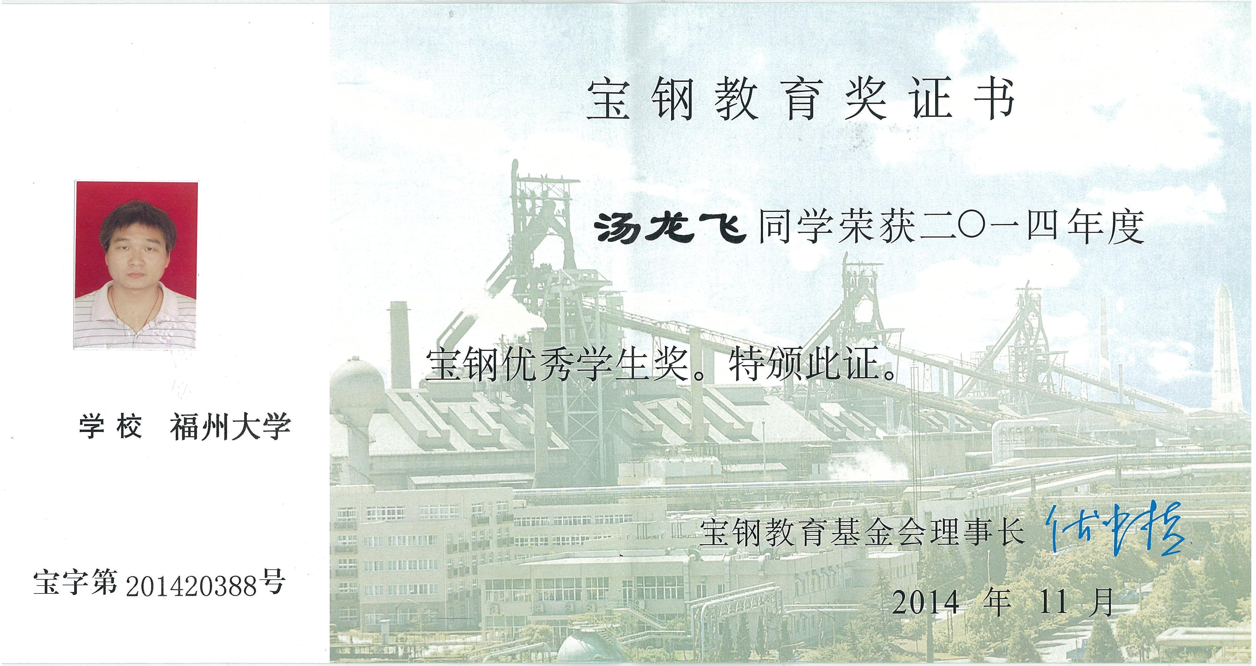 博士生汤龙飞顺利获得2014年“宝钢优秀学生奖”。