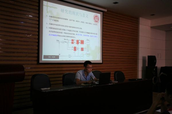 首先进行报告的是王体良同学的《永磁同步电机电流矢量直接控制系统的研究》,王同学思路清晰地展示了永磁同步电机电流控制的模型、方案,然后通过仿真平台进行了仿真验证,对比了三种控制方法的优缺点,最后进行实物验证。接下来顾小兴同学就《变压器局部放电信号噪声干扰抑制》进行了展示,通过严谨地推导,全面地阐释,最终得出了噪声干扰抑制的算法设计。紧接着王添羡同学对《多级滤波滑模观测器的PMSM无位置传感器矢量控制》进行阐述,多级滤波滑模观测器是基于单级滤波滑模观测器的进一步改进,改善了滤波效果和信号的衰竭速度,效果有明显的提升,之后王同学与鲍光海老师进行了讨论,就文中的一些问题交换了想法。之后陈盛良同学展示了《基于单处理器的组合式三相逆变电源分相调制技术》,陈盛良同学条理清晰,思路严谨,一步一步介绍了自己的研究工作,大家都被他扎实的理论功底所折服。最后王竹勤同学的《热力学平衡状态下的等离子体电导率计算》的报告更是精彩万分,复杂的公式推导和逻辑过程被娓娓道来,王同学勤奋认真的态度在报告中展现的淋漓尽致。