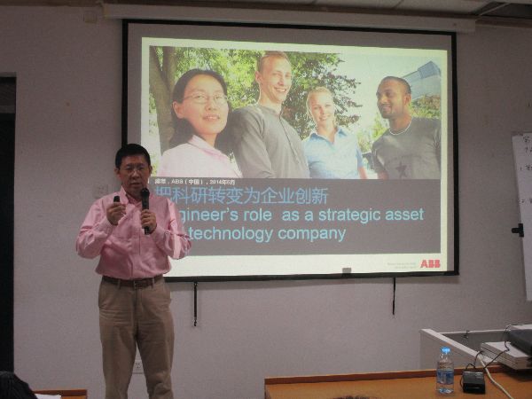 活动分多个模块进行,主持人在开场时向大家介绍了活动的主要议程并充分调动了大家参与活动的积极性。接着,ABB(中国)变压器技术中心负责人蒋莘先生向大家介绍了企业产品的价值以及企业对于客户以及产品如何定位的问题。蒋莘先生的介绍对于一直在学校学习而没有接触过社会及企业运作的同学们来说是受益匪浅,大家了解了一个企业如何成功运作,为今后的工作做些准备。另外,来自ABB(中国)中压产品技术中心的高级工程师格秀山先生以自己长期从事技术工作的经验为依托,向大家介绍了如何面对挑战通过创新与创造来使自己的产品不断优化,不断向用户的需求靠近。通过格秀山先生的启发,大家对创新与创造的定义有了清晰的认识,同时启发了自身的创造潜力。现场还为大家设计了一个现场创新竞赛,同学们通过竞赛在短时间内讨论完成一个产品的定位与说明,极大地挖掘了大家的创造能力。最后,主持人还向大家介绍了有关暑期实习的问题。