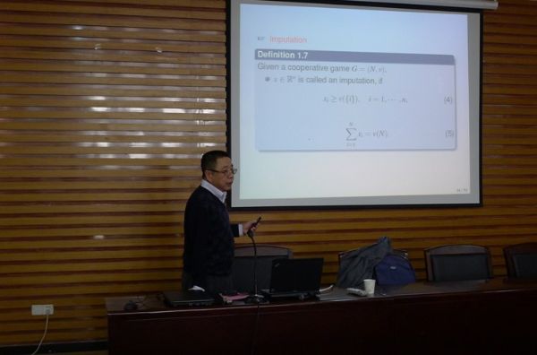 在陈为院长的开场介绍后,大家对程代展研究员有了初步了解,也充满期待。随后学术报告开始。首先,程研究员以简单明了的例子,向大家介绍了博弈论,结合例子,分别阐述了合作博弈,动态博弈,演化博弈等,并用表格、方程的形式详尽的讲解。内容层层递进,公式环环相扣,最终得出用半张量积求解博弈过程的优势所在,并推广半张量积的方法,运用到多个领域。在场同学不仅认真做笔记,同学积极参与到互动提问中,整个报告会在和谐、浓烈的学术气氛中进行着。