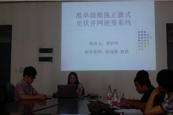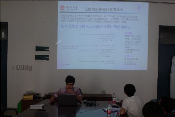 首先亮相出场的是黄伏送同学,介绍其对三相Boost型并网逆变器的理解及研究;接下来的是周伊玲同学对“准单级推挽正激式光伏并网逆变系统”的讲解,谦逊的态度和临场应答为报告加分不少;紧接的张煜同学,略带腼腆的他跟大家分享的是“传导EMI建模与仿真分析”;钟晓龙同学做的是时下最炙手可热的课题——无线电能传输技术,并PPT中展示了实物,点亮了2个LED,并指出了其传输效率的问题;其后的郑剑斌同学讲述的是“磁通门电流传感器磁系统研究”;最后是马俊亭同学做关于三相异步电机的矢量模型的分析,独到的见解和细心地科研态度在其满满的公式推导中可见一斑。