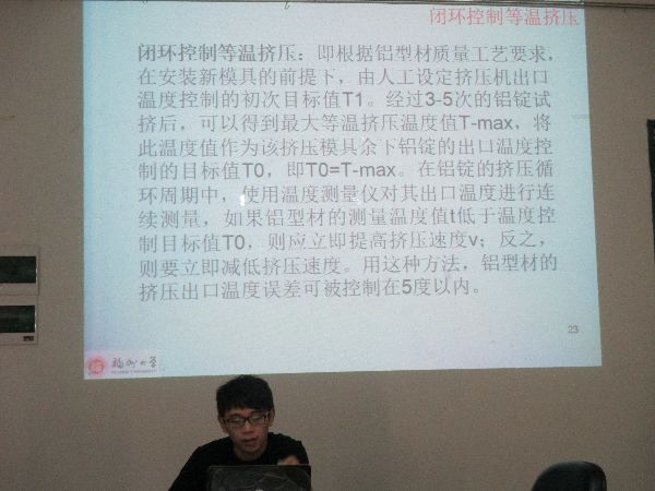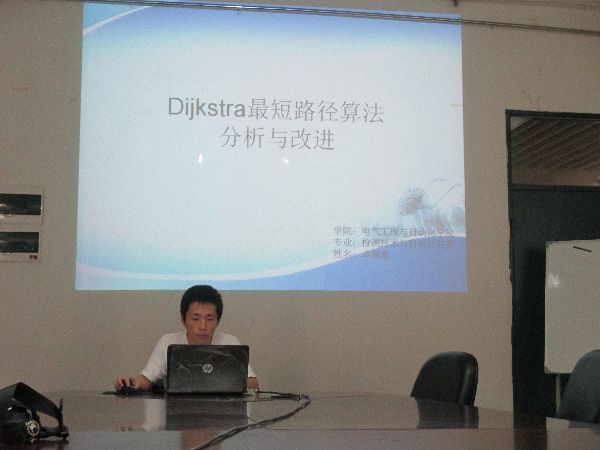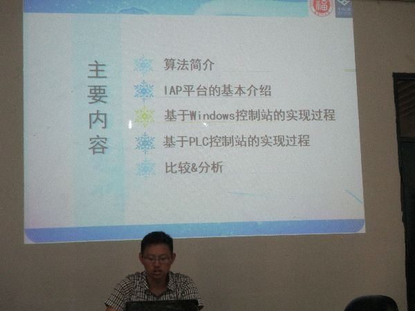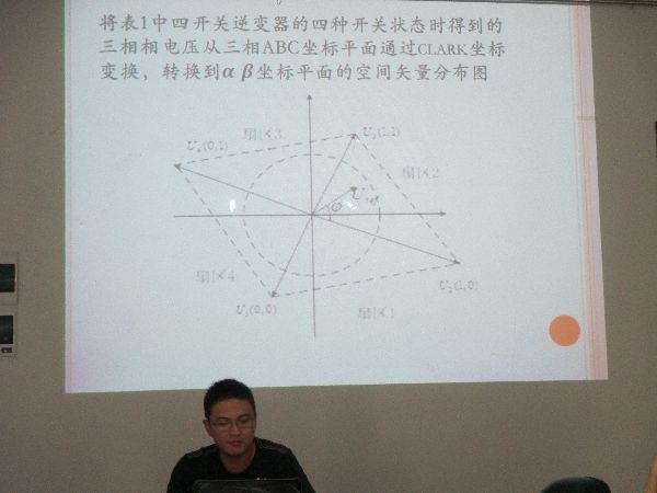 第一位报告的邓潇同学以清晰的思路结合形象的图形说明向同学们介绍了单神经元PID在IAP中实现控制仿真的开发与实验过程,为其他几位同学开了一个好头。接着,卓振泰、矫正国、陈弘哲、陈志卿、方小致与寻鑫同学分别向大家介绍了Dijkstra最短路径算法、路灯系统移动监控终端研究、基于三相四开关逆变器的SVPWM调制算法的研究、EKF应用于KOA运动疗法规范性的研究、在线免疫遗传PID在锅炉主蒸汽温度串级控制中的应用和基于迭代学习控制的铝型材等温挤压的技术研究等内容。在每位同学报告后,同学们针对报告内容进行互相提问与讨论,老师也针对报告的内容也作出了十分精彩的点评。在老师的点评下,同学们认识到了自己所研究的内容存在的不足,为自己今后更深入的研究提供了明确的方向。
