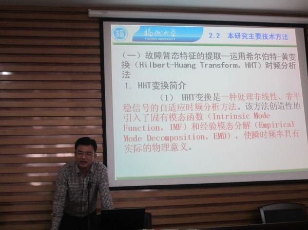 首 先蔡金锭教授作了《电力变压器绝缘老化诊断方法》的报告,列出了变压器绝缘诊断的研究意义、油浸式电力变压器的非电量(化学)诊断和介质响应诊断两类诊断 方法、本研究所用的基于时域-微分解谱分析法等,经验证,蔡老师所提出的微分解谱分析法是正确可行的,这是科学理论的一种突破。接着杨耿杰教授作了《谐振 接地系统单相接地故障分类选线的研究》的报告,介绍了谐振接地系统的四种选线方法、本研究的主要技术方法、仿真实例的分析等,杨老师所做的仿真模拟结果达 到了精度的要求,说明了本研究的技术方法正确有效。然后陈道炼教授作了《准单级高效高频环节并网逆变器》的报告,介绍了准单级式并网逆变器及其主要组成部 分。接着林维明教授作了《改进单周期控制策略的大变化DC-DC开关变换器》的报告,详细介绍了改进的方法以及改进后达到的效果。最后林国庆教授介绍了 《汽车HID灯电子镇流器》的报告,对HID灯以及其控制方法进行了介绍。
