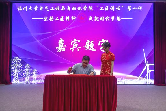 讲座结束后,钟钛申书记为林主任颁发嘉宾证书,学生代表为林主任献花,林主任也为“工匠讲坛”留下珍贵的墨宝。